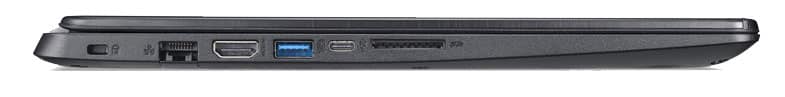 En plus d’un connecteur HDMI et RJ-45 à part entière, Acer a également pu intégrer une prise USB 3.0 de type A et un connecteur USB de type C non rotatif. Le lecteur de carte est conçu pour les cartes mémoire SD.