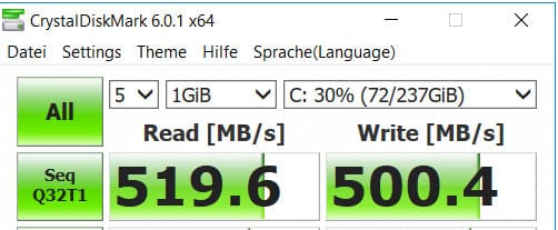 Acer a installé un module M.2 de 256 Go dans l’Aspire 5 comme mémoire fixe. Cela offre des taux de transfert d’environ 500 Mo/s. Ceux-ci sont nettement plus rapides qu’un disque dur, mais le module M.2 intégré est relativement lent. Il existe sur le marché des modules M.2 beaucoup plus rapides.